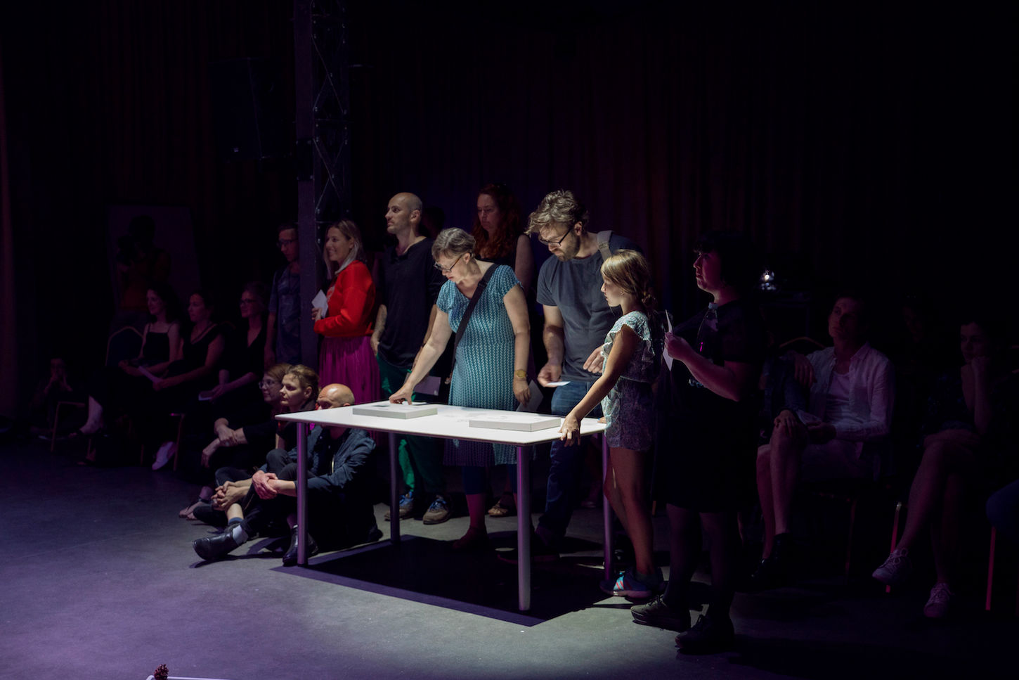 Two gentle beasts lost in space and time, sad and ready to destroy or discover. Is it a joke or happening right now? The performance is a love situation – unpredictable intention of trust and anticipation. They exist on a fragile border of silly playing and living through, and then they disappear. Interactive performance where the audience takes control over the monsters.